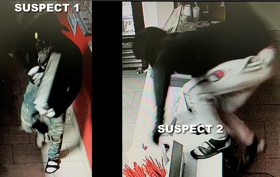 The suspects then went to the neighboring business, Palace Pizza, and entered it by breaking the glass with a large rock.